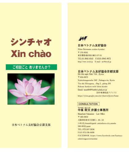 このリーフ「シンチャオ京都版」の、全14ページ日越語併記は日本ベトナム友好協会全国的にも初の試みです。(「シンチャオ」とは、「こんにちは」の意味)