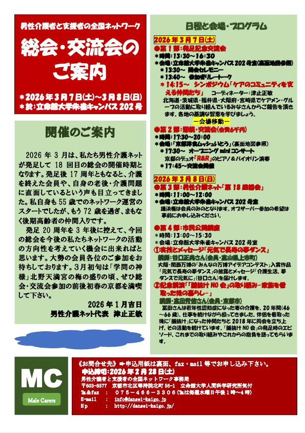 さてこの私は、3月上旬「男性介護全国ネット全国総会In京都」での記念講演。